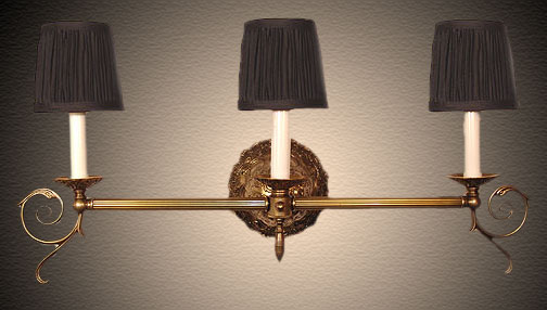 Customize the width on this elegant bar light to create that Classic historic Colonial look in your own style. Shown in antique brass, reeded tubing, with black clip on pleated shades. White, Rose, and Egg Shell shades also available.